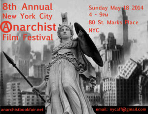 NEW YORK, NY – The eighth annual NYC Anarchist Film Festival is Sunday May 18th, in Manhattan’s East Village. The AFF will be screening a variety of short films that celebrate the spirit of resistance and liberation amid the increasing criminalization of dissent around the world. The AFF, is a participatory event where the screenings spark vigorous discussion about the possibilities of political change and cultural transformation.